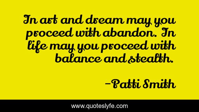 This page presents the quote "In art and dream may you proceed with abandon. In life may you proceed with balance and stealth.". Author of this quote is Patti Smith. This quote is about life, balance, dream,.