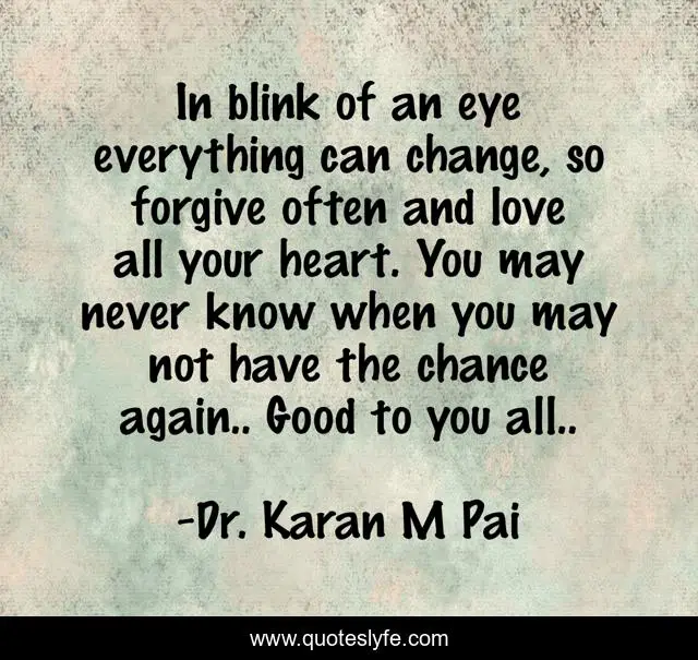 This page presents the quote "In blink of an eye everything can change, so forgive often and love all your heart. You may never know when you may not have the chance again.. Good to you all..". Author of this quote is Dr. Karan M Pai. This quote is about tomorrow-will-be-better, life-and-living, forgiveness,.