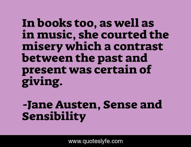 This page presents the quote "In books too, as well as in music, she courted the misery which a contrast between the past and present was certain of giving.". Author of this quote is Jane Austen, Sense and Sensibility. This quote is about past, sorrow, present, misery,.