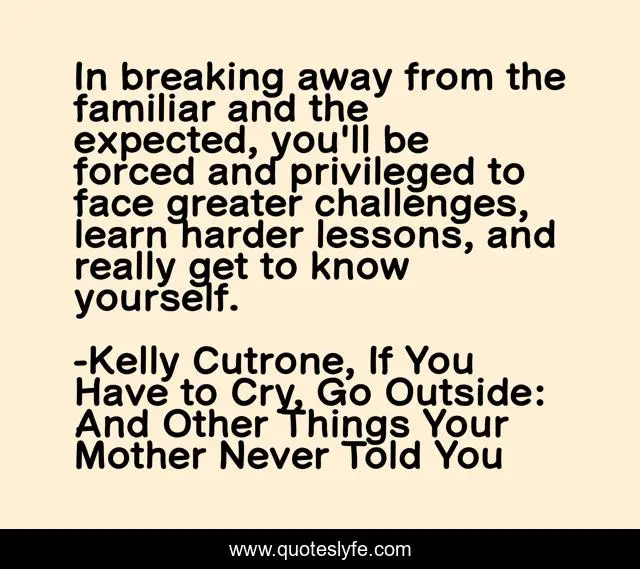 This page presents the quote "In breaking away from the familiar and the expected, you'll be forced and privileged to face greater challenges, learn harder lessons, and really get to know yourself.". Author of this quote is Kelly Cutrone, If You Have to Cry, Go Outside: And Other Things Your Mother Never Told You. .