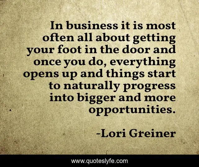 This page presents the quote "In business it is most often all about getting your foot in the door and once you do, everything opens up and things start to naturally progress into bigger and more opportunities.". Author of this quote is Lori Greiner. This quote is about progress, opportunities,.