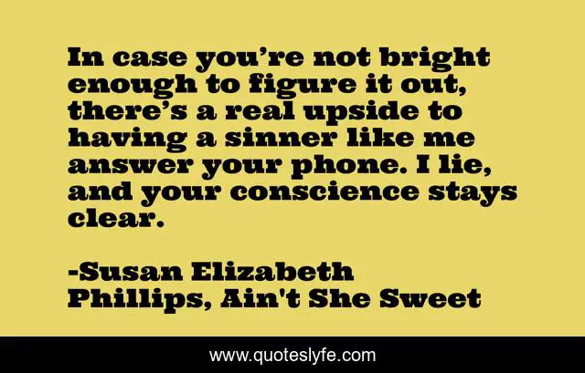 This page presents the quote "In case you’re not bright enough to figure it out, there’s a real upside to having a sinner like me answer your phone. I lie, and your conscience stays clear.". Author of this quote is Susan Elizabeth Phillips, Ain't She Sweet. This quote is about conscience, lie, phone, sinner,.