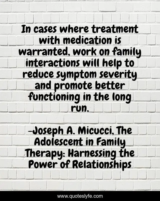This page presents the quote "In cases where treatment with medication is warranted, work on family interactions will help to reduce symptom severity and promote better functioning in the long run.". Author of this quote is Joseph A. Micucci, The Adolescent in Family Therapy: Harnessing the Power of Relationships. This quote is about counseling, psychology, family-therapy,.