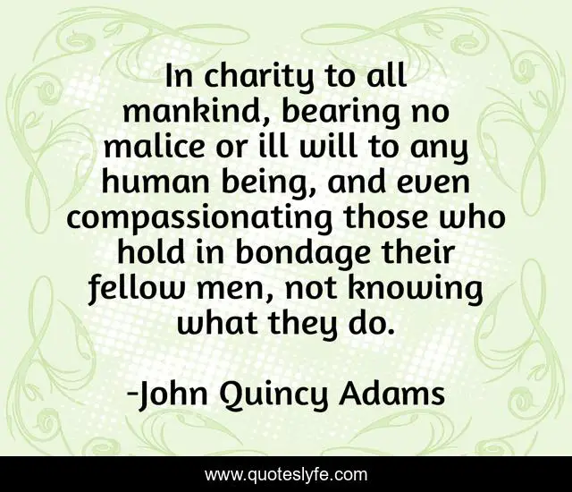 This page presents the quote "In charity to all mankind, bearing no malice or ill will to any human being, and even compassionating those who hold in bondage their fellow men, not knowing what they do.". Author of this quote is John Quincy Adams. This quote is about secular-ethics, secular-morality, mankind, charity,.