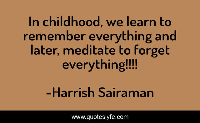 This page presents the quote "In childhood, we learn to remember everything and later, meditate to forget everything!!!!". Author of this quote is Harrish Sairaman. This quote is about life, forget, everything, meditate, meditation, inspiration, childhood, remember,.