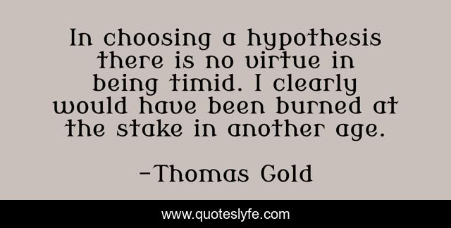 This page presents the quote "In choosing a hypothesis there is no virtue in being timid. I clearly would have been burned at the stake in another age.". Author of this quote is Thomas Gold. This quote is about heretic, brave, intolerance, science, age, stake, hypothesis, virtue, heresy,.