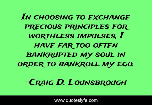 This page presents the quote "In choosing to exchange precious principles for worthless impulses, I have far too often bankrupted my soul in order to bankroll my ego.". Author of this quote is Craig D. Lounsbrough. This quote is about selfish, bankrupt, entitlement, superificality, impulses, shallow, principles, foolishness, impulsive,.