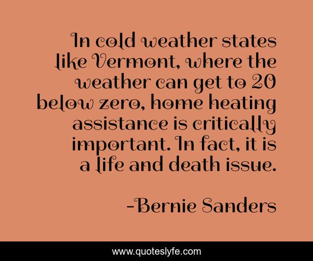 This page presents the quote "In cold weather states like Vermont, where the weather can get to 20 below zero, home heating assistance is critically important. In fact, it is a life and death issue.". Author of this quote is Bernie Sanders. This quote is about home, life, weather,.