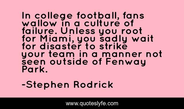 This page presents the quote "In college football, fans wallow in a culture of failure. Unless you root for Miami, you sadly wait for disaster to strike your team in a manner not seen outside of Fenway Park.". Author of this quote is Stephen Rodrick. This quote is about culture, football, team,.