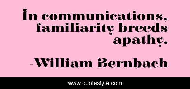 This page presents the quote "In communications, familiarity breeds apathy.". Author of this quote is William Bernbach. This quote is about apathy, familiarity,.