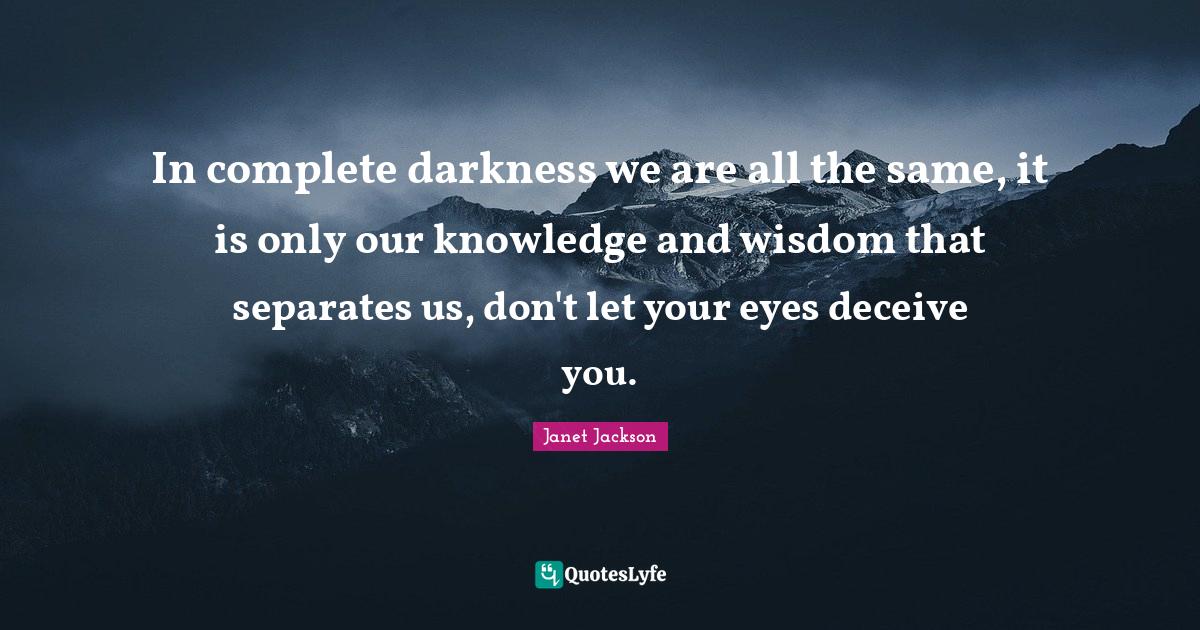 This page presents the quote "In complete darkness we are all the same, it is only our knowledge and wisdom that separates us, don't let your eyes deceive you.". Author of this quote is Janet Jackson. This quote is about eyes, darkness, wisdom,.