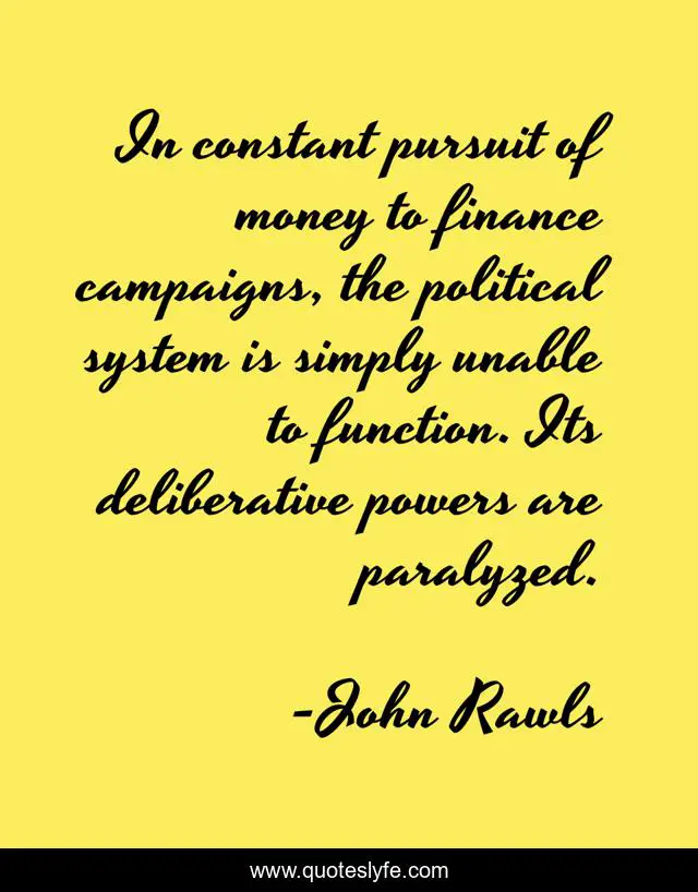 This page presents the quote "In constant pursuit of money to finance campaigns, the political system is simply unable to function. Its deliberative powers are paralyzed.". Author of this quote is John Rawls. This quote is about money, political, system,.