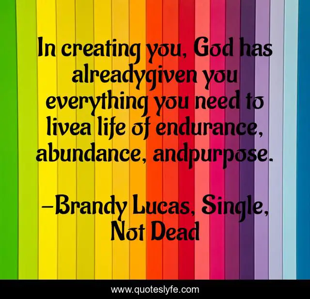 This page presents the quote "In creating you, God has alreadygiven you everything you need to livea life of endurance, abundance, andpurpose.". Author of this quote is Brandy Lucas, Single, Not Dead. This quote is about enthusiasm, self-esteem, inspirational, relationship, self-help,.