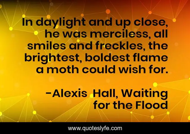 This page presents the quote "In daylight and up close, he was merciless, all smiles and freckles, the brightest, boldest flame a moth could wish for.". Author of this quote is Alexis Hall, Waiting for the Flood. This quote is about smiles, freckles, daylight, flame, mother, merciless,.