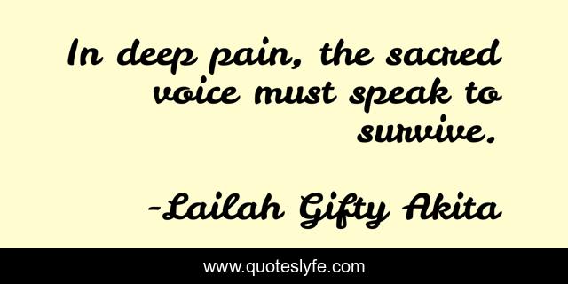 This page presents the quote "In deep pain, the sacred voice must speak to survive.". Author of this quote is Lailah Gifty Akita. This quote is about pain, survival-instinct, wise, spiritual-wisdom,.