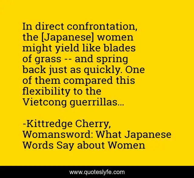 This page presents the quote "In direct confrontation, the [Japanese] women might yield like blades of grass -- and spring back just as quickly. One of them compared this flexibility to the Vietcong guerrillas…". Author of this quote is Kittredge Cherry, Womansword: What Japanese Words Say about Women. This quote is about japan, women,.