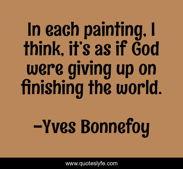 This page presents the quote "In each painting, I think, it’s as if God were giving up on finishing the world.". Author of this quote is Yves Bonnefoy. This quote is about creation, art, paintings,.