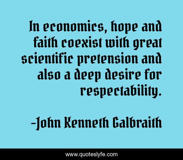 This page presents the quote "In economics, hope and faith coexist with great scientific pretension and also a deep desire for respectability.". Author of this quote is John Kenneth Galbraith. This quote is about faith, great, deep,.