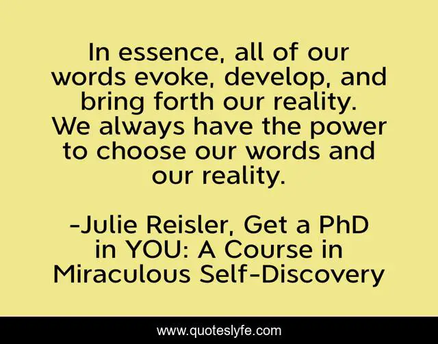 This page presents the quote "In essence, all of our words evoke, develop, and bring forth our reality. We always have the power to choose our words and our reality.". Author of this quote is Julie Reisler, Get a PhD in YOU: A Course in Miraculous Self-Discovery. This quote is about self-love, self-awareness, emotions, behaviour, attitude, inspirational, personal-development, enthusiasm, transformation,.