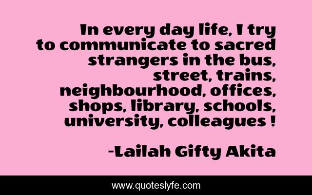 This page presents the quote "In every day life, I try to communicate to sacred strangers in the bus, street, trains, neighbourhood, offices, shops, library, schools, university, colleagues…!". Author of this quote is Lailah Gifty Akita. This quote is about confidence, people, communication, advice, motivational, daily, every-day-life, optimistic, positive,.