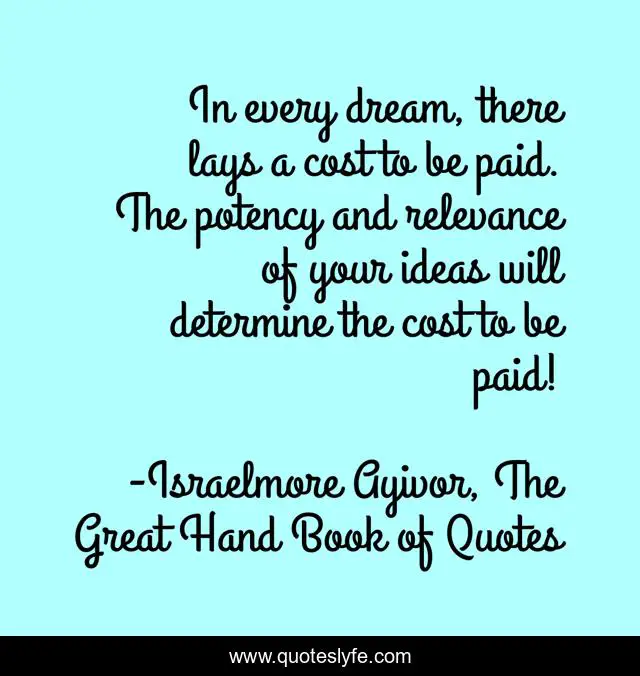 This page presents the quote "In every dream, there lays a cost to be paid. The potency and relevance of your ideas will determine the cost to be paid!". Author of this quote is Israelmore Ayivor, The Great Hand Book of Quotes. This quote is about food-for-thought, relevant, cost, pay, idea, potent, ideas, potency, paid,.