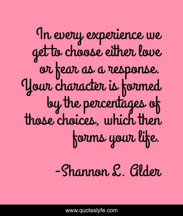 This page presents the quote "In every experience we get to choose either love or fear as a response. Your character is formed by the percentages of those choices, which then forms your life.". Author of this quote is Shannon L. Alder. This quote is about anxiety, fearful, living-with-fear, character, choices, maturity, growth, fear-based-decisions, balance,.