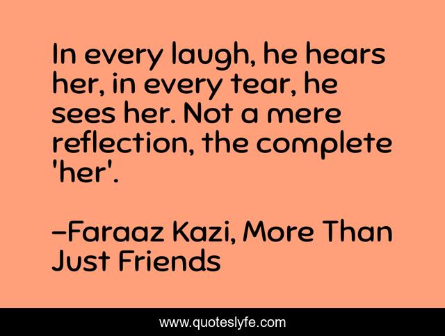 This page presents the quote "In every laugh, he hears her, in every tear, he sees her. Not a mere reflection, the complete 'her'.". Author of this quote is Faraaz Kazi, More Than Just Friends. This quote is about romance, true-love, love, affection,.