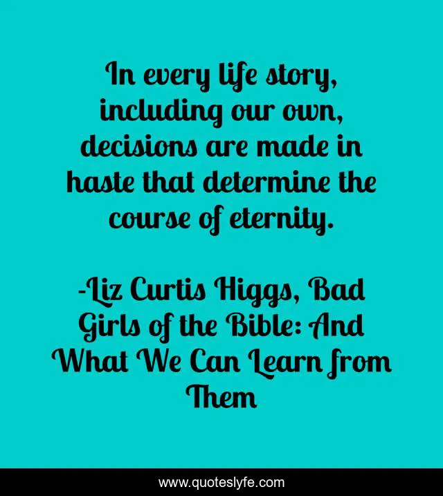 This page presents the quote "In every life story, including our own, decisions are made in haste that determine the course of eternity.". Author of this quote is Liz Curtis Higgs, Bad Girls of the Bible: And What We Can Learn from Them. This quote is about eternity, decisions, haste,.
