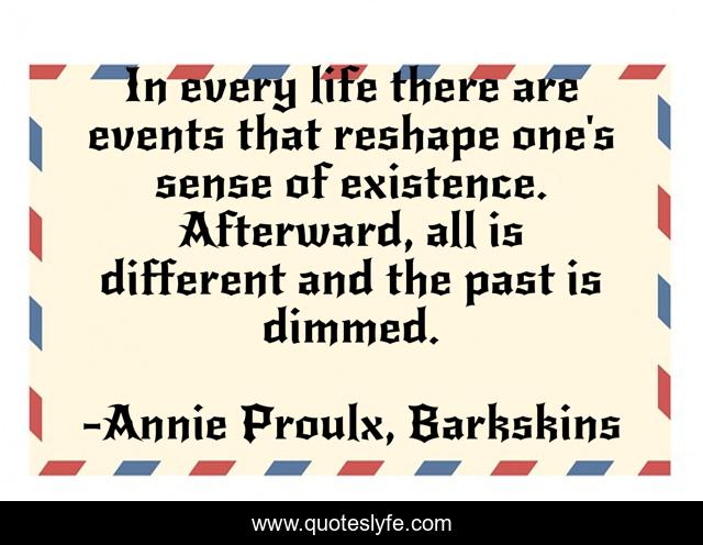 This page presents the quote "In every life there are events that reshape one's sense of existence. Afterward, all is different and the past is dimmed.". Author of this quote is Annie Proulx, Barkskins. This quote is about existentialism, meaning-of-life, nihilism,.