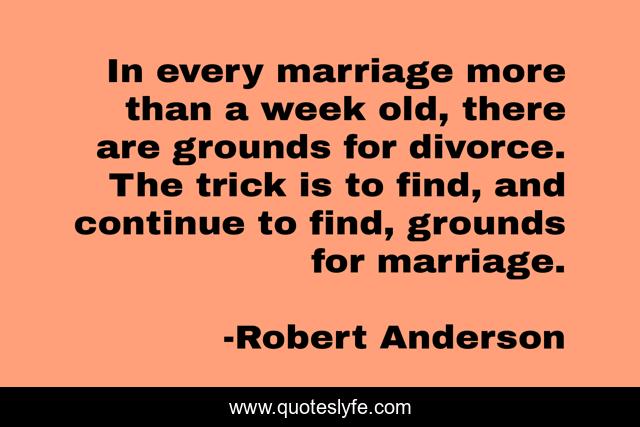 This page presents the quote "In every marriage more than a week old, there are grounds for divorce. The trick is to find, and continue to find, grounds for marriage.". Author of this quote is Robert Anderson. This quote is about week, divorce, find,.