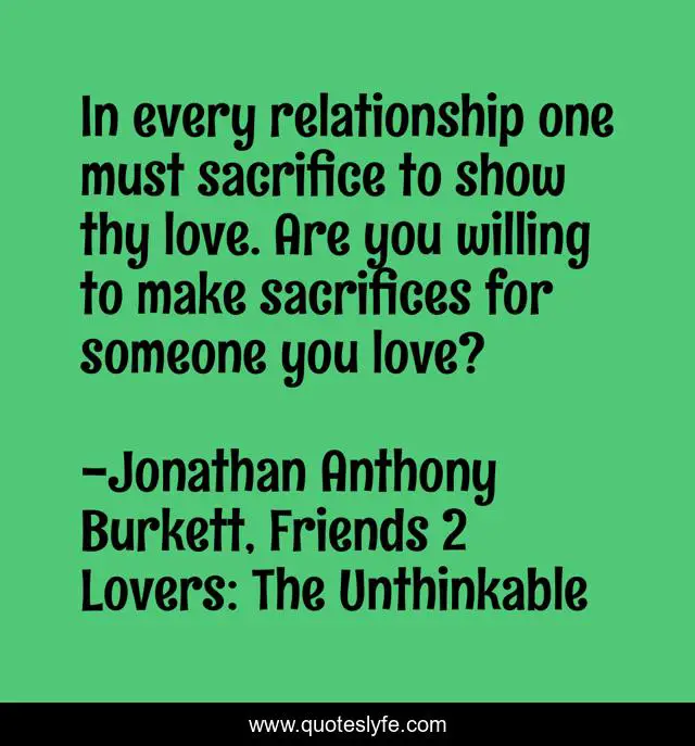 "Jonathan Anthony Burkett, Friends 2 Lovers: The Unthinkable Quotes." Quoteslyfe.com, 2025. Sat. 06 Dec. 2025. <https://www.quoteslyfe.com/quote/In-every-relationship-one-must-sacrifice-to-198520>.
