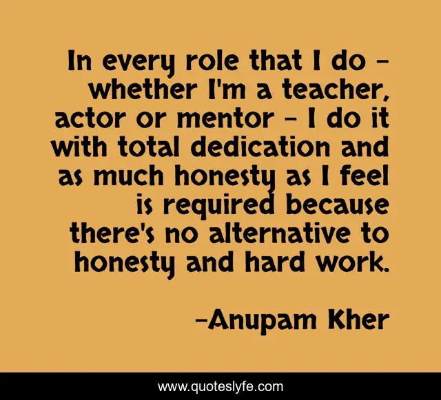 This page presents the quote "In every role that I do - whether I'm a teacher, actor or mentor - I do it with total dedication and as much honesty as I feel is required because there's no alternative to honesty and hard work.". Author of this quote is Anupam Kher. This quote is about work, honesty, hard work,.