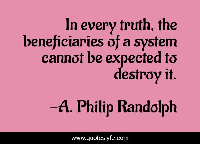 This page presents the quote "In every truth, the beneficiaries of a system cannot be expected to destroy it.". Author of this quote is A. Philip Randolph. This quote is about destroy, system,.