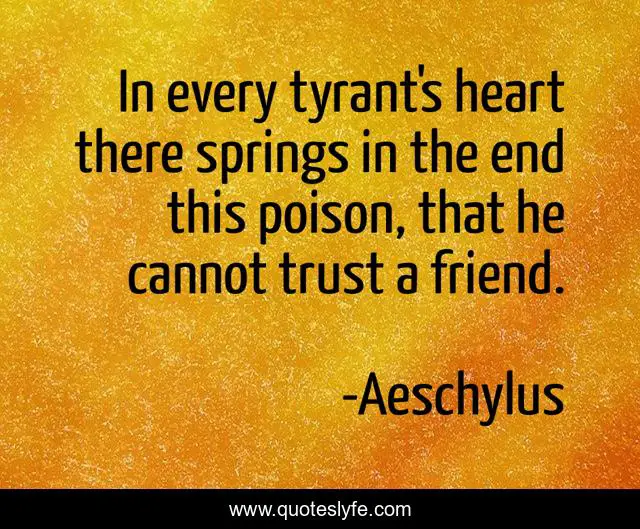 This page presents the quote "In every tyrant's heart there springs in the end this poison, that he cannot trust a friend.". Author of this quote is Aeschylus. This quote is about heart, end, friend,.