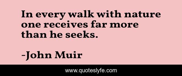 This page presents the quote "In every walk with nature one receives far more than he seeks.". Author of this quote is John Muir. This quote is about far, wisdom, walk,.