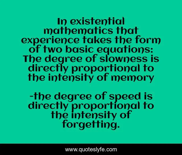 This page presents the quote "In existential mathematics that experience takes the form of two basic equations: The degree of slowness is directly proportional to the intensity of memory". Author of this quote is the degree of speed is directly proportional to the intensity of forgetting.. This quote is about milan kundera, slowness,.