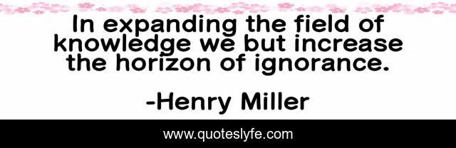 This page presents the quote "In expanding the field of knowledge we but increase the horizon of ignorance.". Author of this quote is Henry Miller. This quote is about ignorance, horizon,.