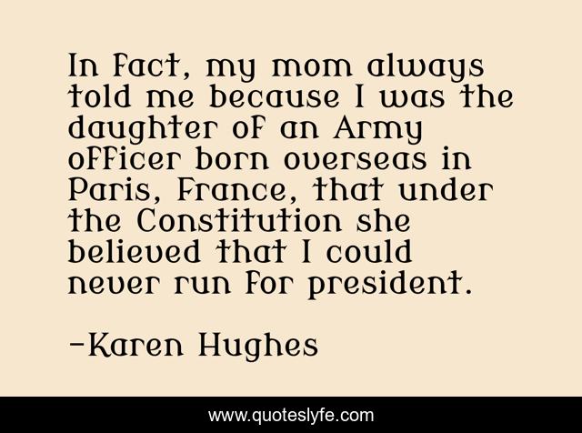 This page presents the quote "In fact, my mom always told me because I was the daughter of an Army officer born overseas in Paris, France, that under the Constitution she believed that I could never run for president.". Author of this quote is Karen Hughes. This quote is about me, daughter, constitution,.