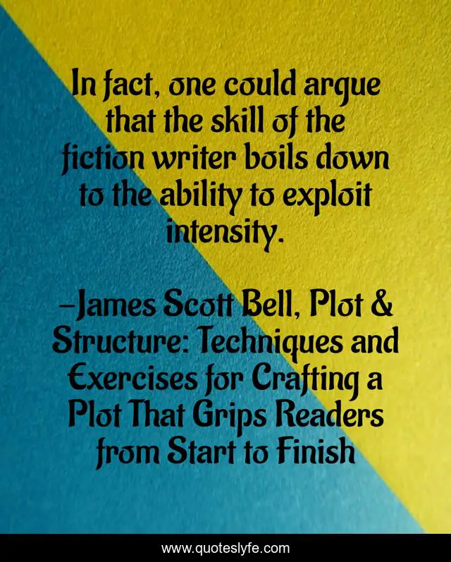 This page presents the quote "In fact, one could argue that the skill of the fiction writer boils down to the ability to exploit intensity.". Author of this quote is James Scott Bell, Plot & Structure: Techniques and Exercises for Crafting a Plot That Grips Readers from Start to Finish. This quote is about writing-craft, writing,.