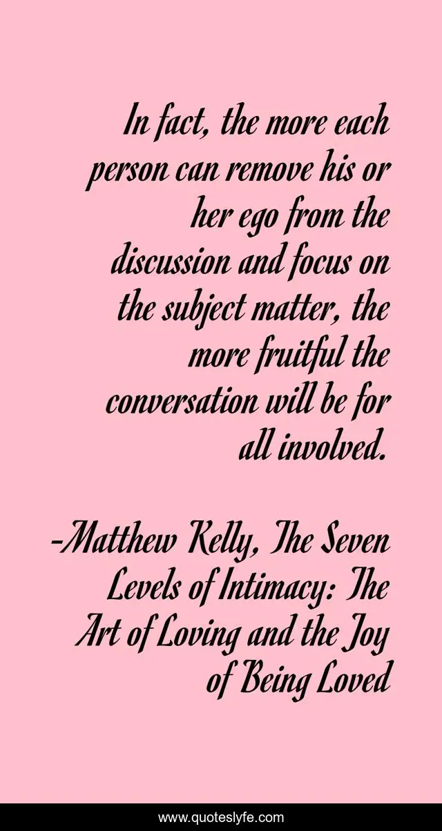 This page presents the quote "In fact, the more each person can remove his or her ego from the discussion and focus on the subject matter, the more fruitful the conversation will be for all involved.". Author of this quote is Matthew Kelly, The Seven Levels of Intimacy: The Art of Loving and the Joy of Being Loved. This quote is about selfish, productive, open-mind, open-minded, discussion, outcome, tolerant, conversation, ego,.