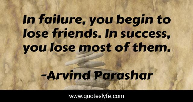 This page presents the quote "In failure, you begin to lose friends. In success, you lose most of them.". Author of this quote is Arvind Parashar. This quote is about failure, life, friends, success,.