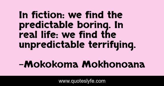 "Mokokoma Mokhonoana Quotes." Quoteslyfe.com, 2025. Fri. 05 Dec. 2025. <https://www.quoteslyfe.com/quote/In-fiction-we-find-the-predictable-boring-101235>.
