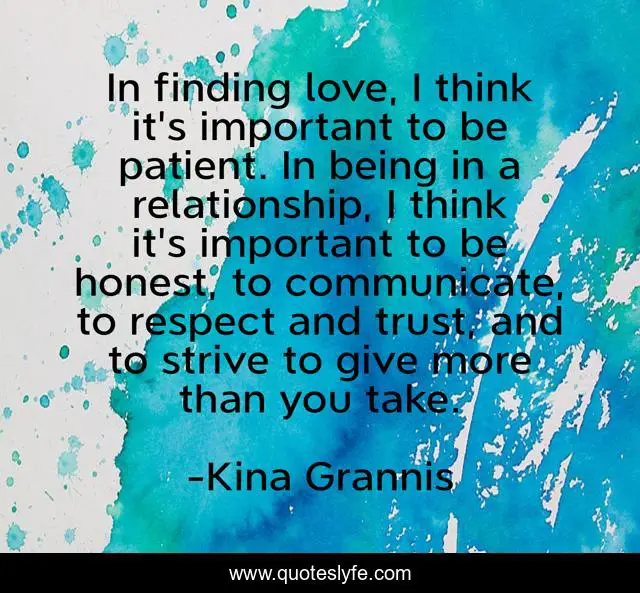 This page presents the quote "In finding love, I think it's important to be patient. In being in a relationship, I think it's important to be honest, to communicate, to respect and trust, and to strive to give more than you take.". Author of this quote is Kina Grannis. This quote is about trust, love, relationship, affection,.