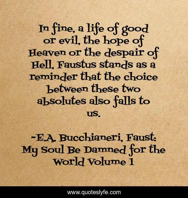 This page presents the quote "In fine, a life of good or evil, the hope of Heaven or the despair of Hell, Faustus stands as a reminder that the choice between these two absolutes also falls to us.". Author of this quote is E.A. Bucchianeri, Faust: My Soul Be Damned for the World Volume 1. This quote is about faustian-legend, catholic, good, christian, faustus, consequences, faustian, evil-men, evil,.