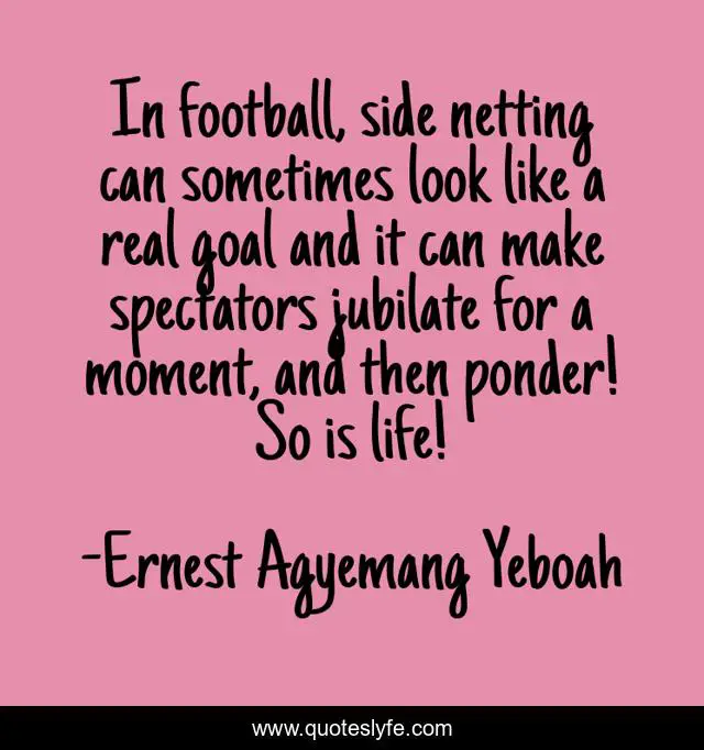 This page presents the quote "In football, side netting can sometimes look like a real goal and it can make spectators jubilate for a moment, and then ponder! So is life!". Author of this quote is Ernest Agyemang Yeboah. This quote is about deferred-hope, football, deception, fantasies,.