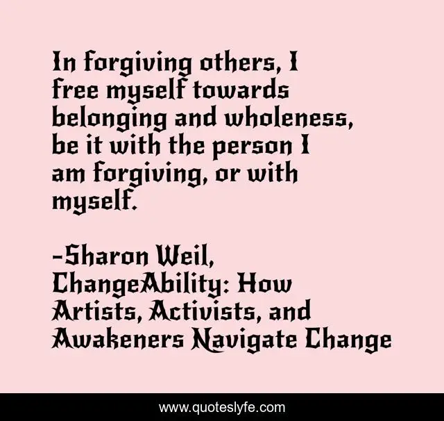 This page presents the quote "In forgiving others, I free myself towards belonging and wholeness, be it with the person I am forgiving, or with myself.". Author of this quote is Sharon Weil, ChangeAbility: How Artists, Activists, and Awakeners Navigate Change. This quote is about freedom, free, self-improvement, forgiveness, wholeness, change,.