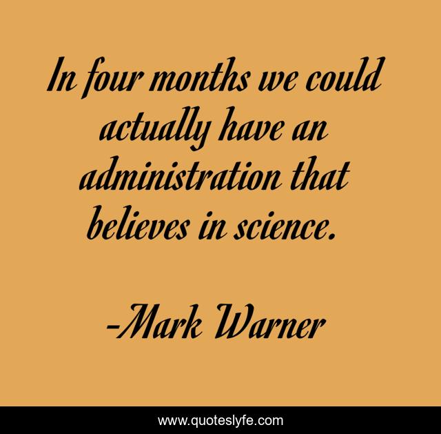 This page presents the quote "In four months we could actually have an administration that believes in science.". Author of this quote is Mark Warner. This quote is about politics, science, common-sense, values, global-warming,.