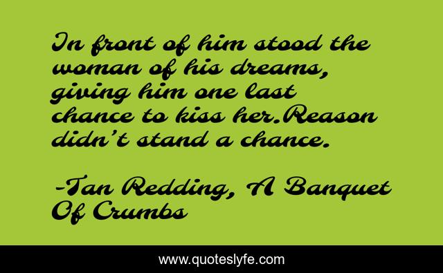 This page presents the quote "In front of him stood the woman of his dreams, giving him one last chance to kiss her.Reason didn’t stand a chance.". Author of this quote is Tan Redding, A Banquet Of Crumbs. This quote is about desire, loss, lovers, love, contemporary-romance, fate, passion, sin, affection,.