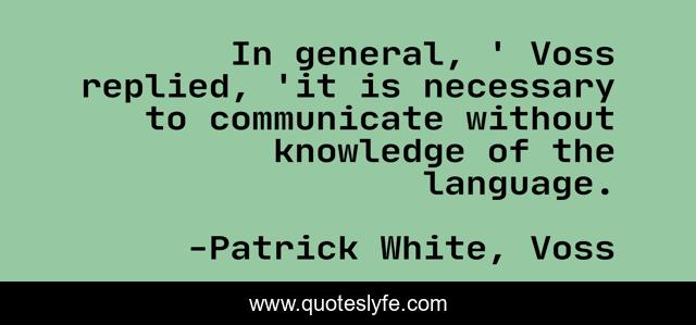 This page presents the quote "In general, ' Voss replied, 'it is necessary to communicate without knowledge of the language.". Author of this quote is Patrick White, Voss. This quote is about australian-literature, aboriginal, language, communication,.