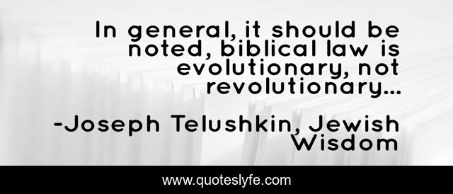 This page presents the quote "In general, it should be noted, biblical law is evolutionary, not revolutionary...". Author of this quote is Joseph Telushkin, Jewish Wisdom. This quote is about bible, bible-interpretation, biblical-law, torah, biblical-scholarship, religion, biblical-morality, change, tanakh-biblical-interpretation,.